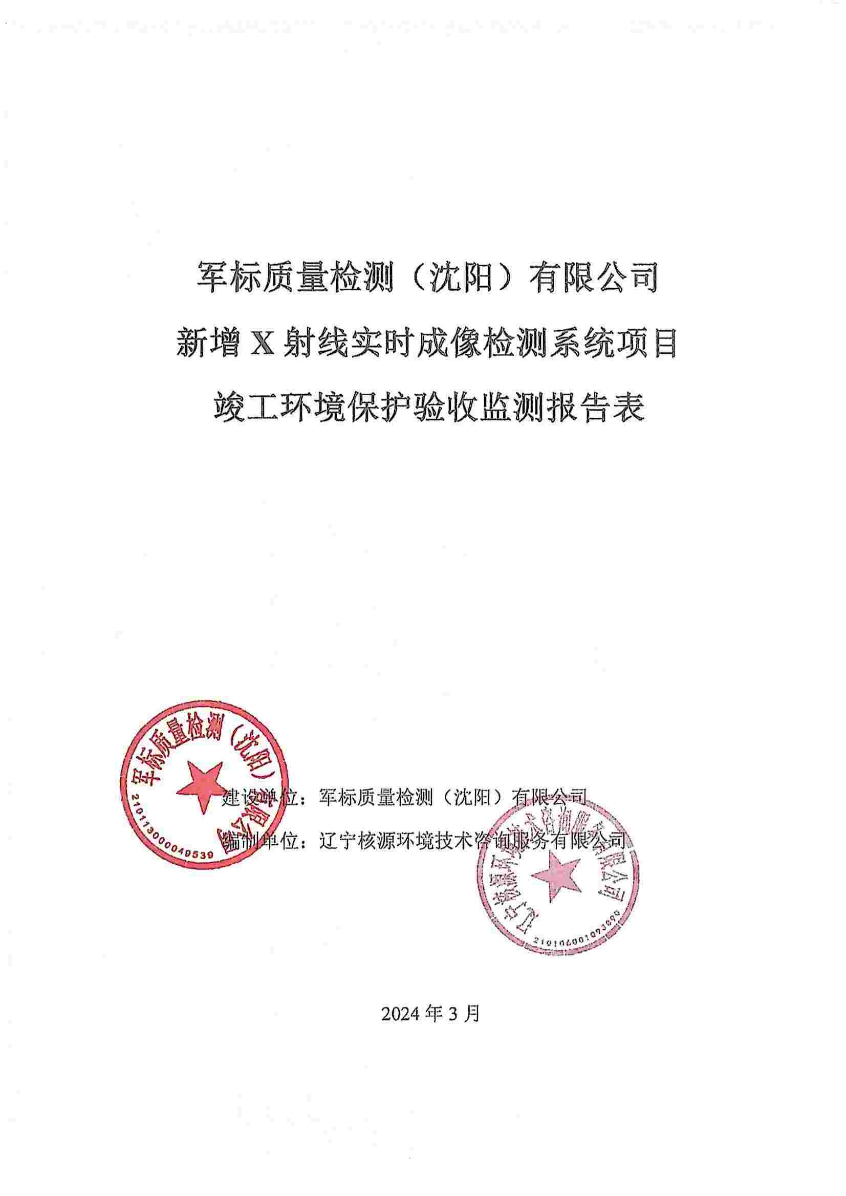 军标质量检测(沈阳)有限公司验收新增X射线实时成像检测系统项目竣工环境保护验收